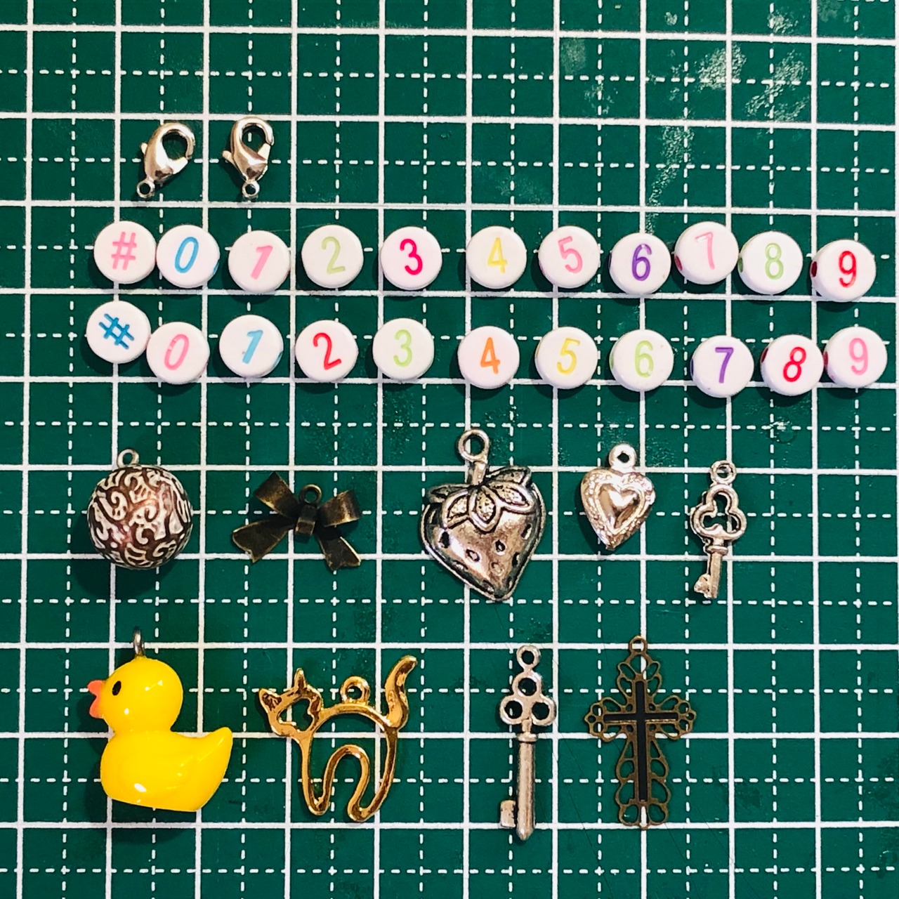 ★数字1.2.3.4.5.6.7.8.9.0.(6と9は同じ)と#、ご希望のチャーム1個に、小さなカニカン2個のセットです。